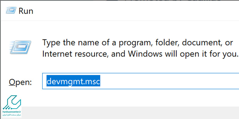 برای رفع ایراد قطعی صدای لپ تاپ دل یا هر برند دیگری، بد نیست که درایورهای صدا را از نو نصب کنید. Device manager را باز کرده و سخت افزار لپ تاپ تان را مدیریت کنید. دستگاه هایی که به درستی کار نمی کنند، در این بخش علامت زده شده اند. برای باز کردن Device manager دکمه های ویندوز و R را فشار دهید و devmgmt.msc را تایپ و اینتر کنید.