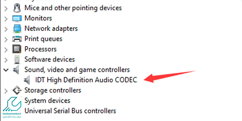 - از بخش Sound, video and game controllers روی آیتم IDT High Definition Audio CODEC کلیک راست نمایید. سپس از بین موارد ظاهر شده گزینه Update Driver را برگزینید.